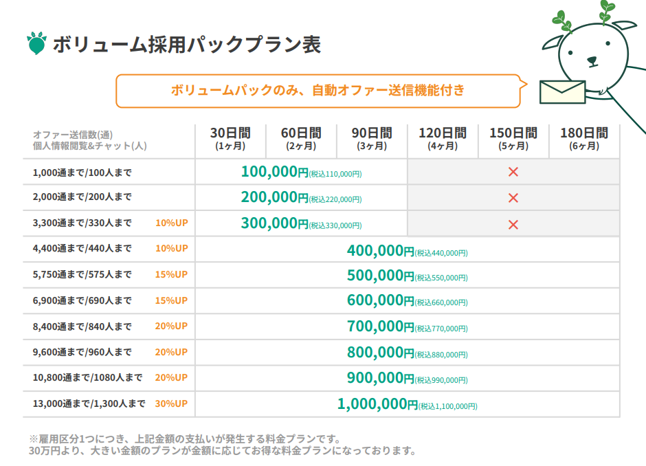 一定数以上のオファー送信を予定している企業様向けに「ボリューム採用パックプラン」が用意されています。
